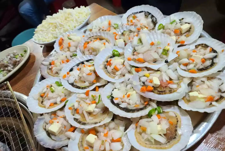 Grilled shellfish is a must-try in Busan. The variety includes scallops, clams, and abalone, all grilled with butter, garlic, and cheese for an indulgent treat.