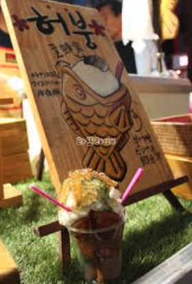 This dessert combines the classic bungeoppang pastry with soft-serve ice cream. The fish-shaped cone is usually filled with red bean paste or custard and topped with creamy ice cream.