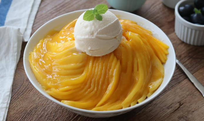 This shaved ice dessert is topped with fresh mango slices, sweet condensed milk, and ice cream. It’s perfect for cooling off on warm evenings.