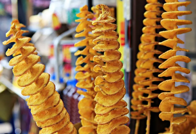 A whole potato is spiraled onto a stick, deep-fried, and sprinkled with various seasonings like cheese, barbecue, or honey butter.