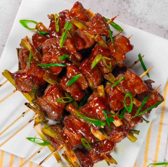 Juicy pork belly chunks marinated in a spicy sauce and grilled to perfection make this a hearty snack.